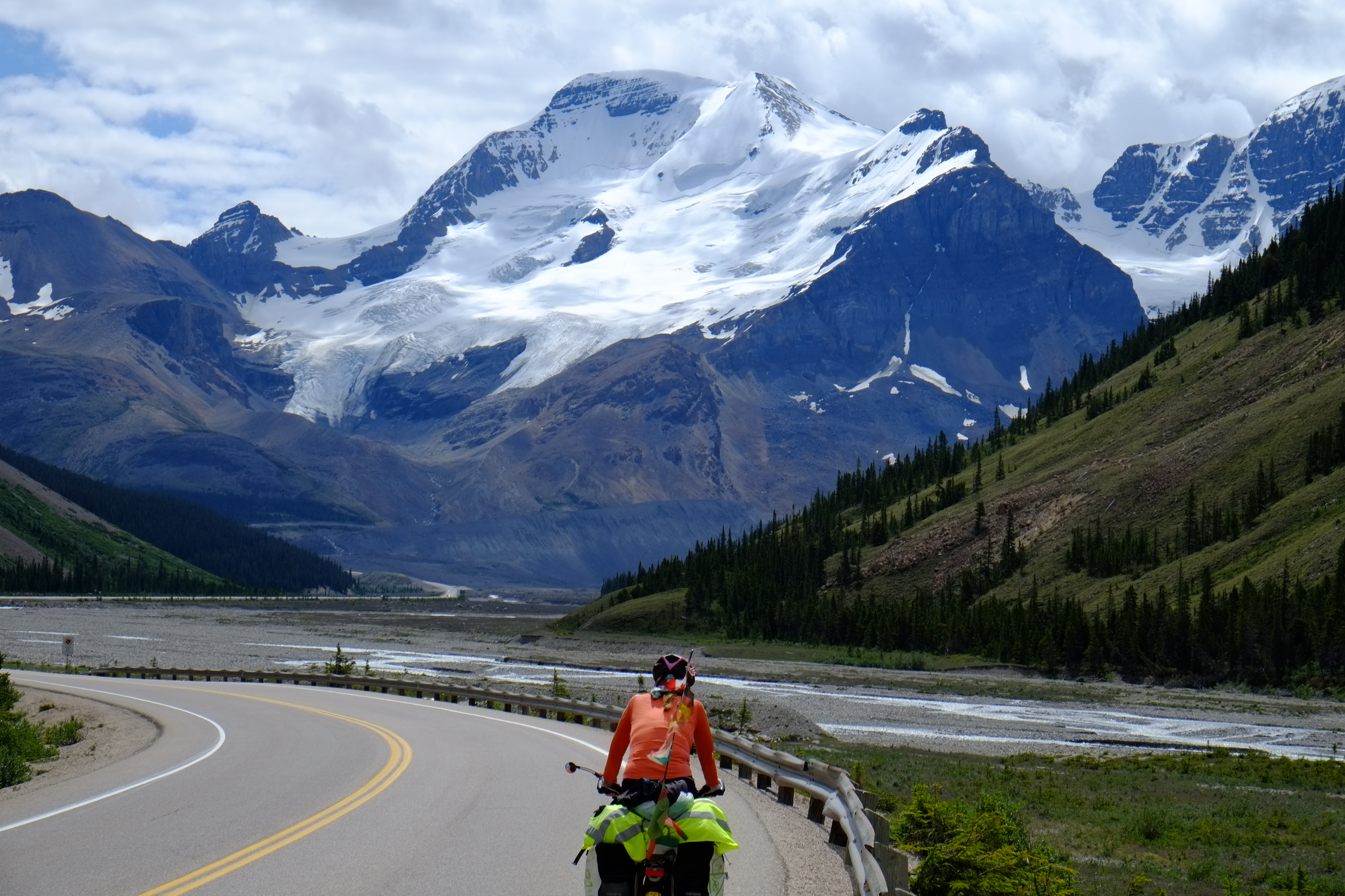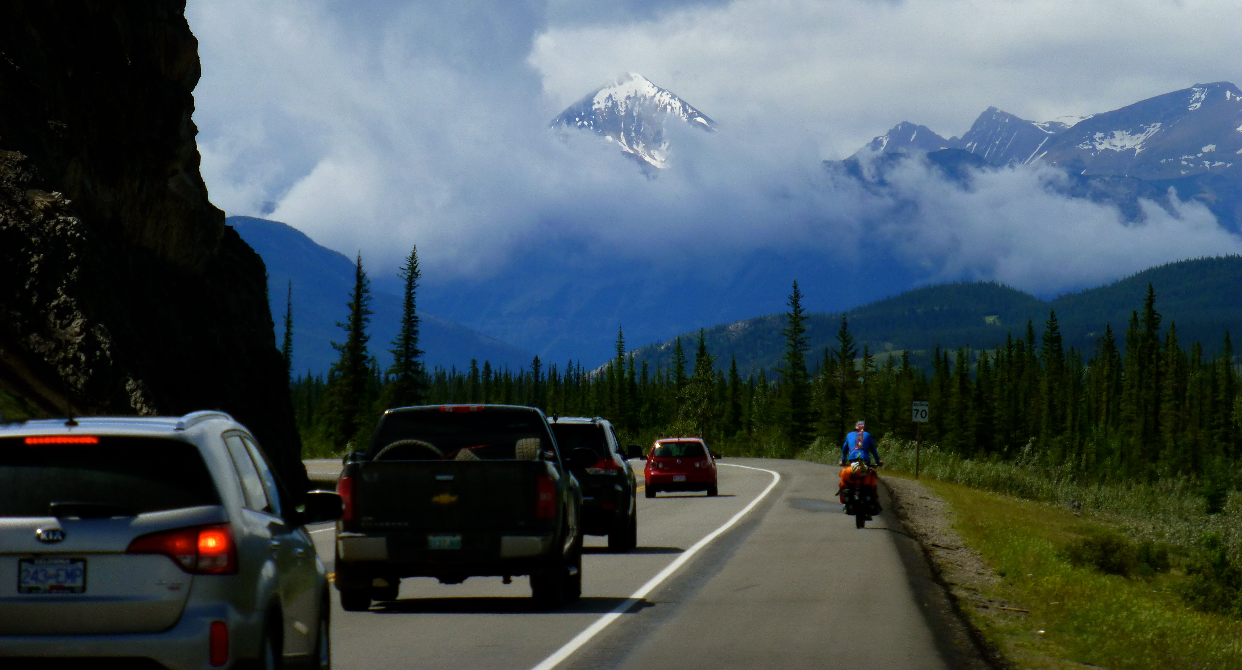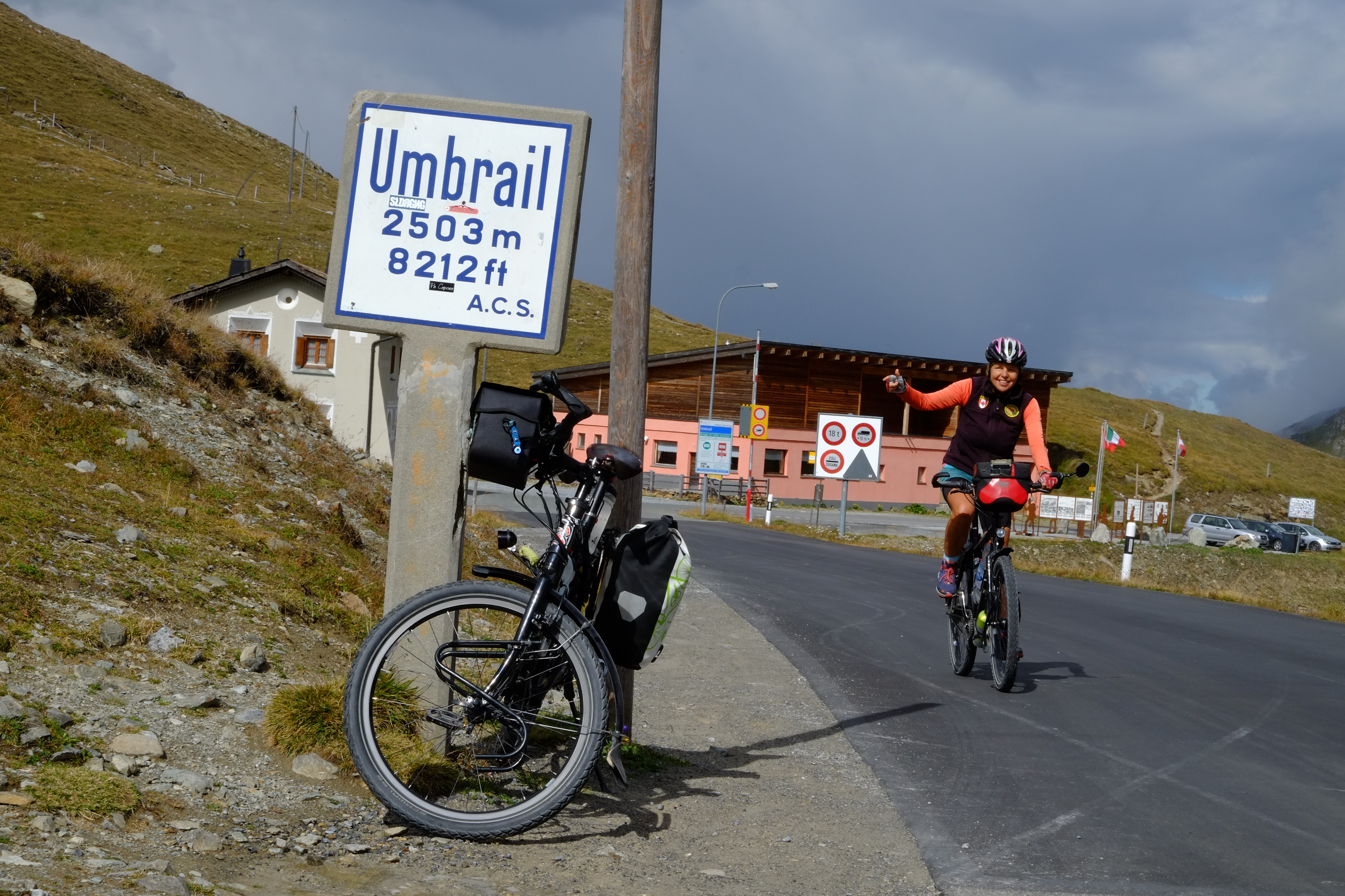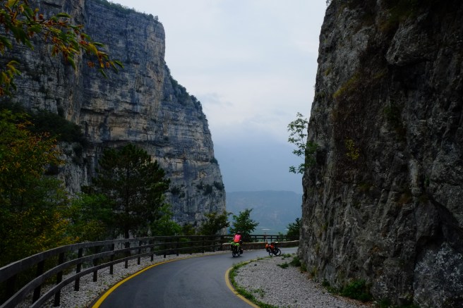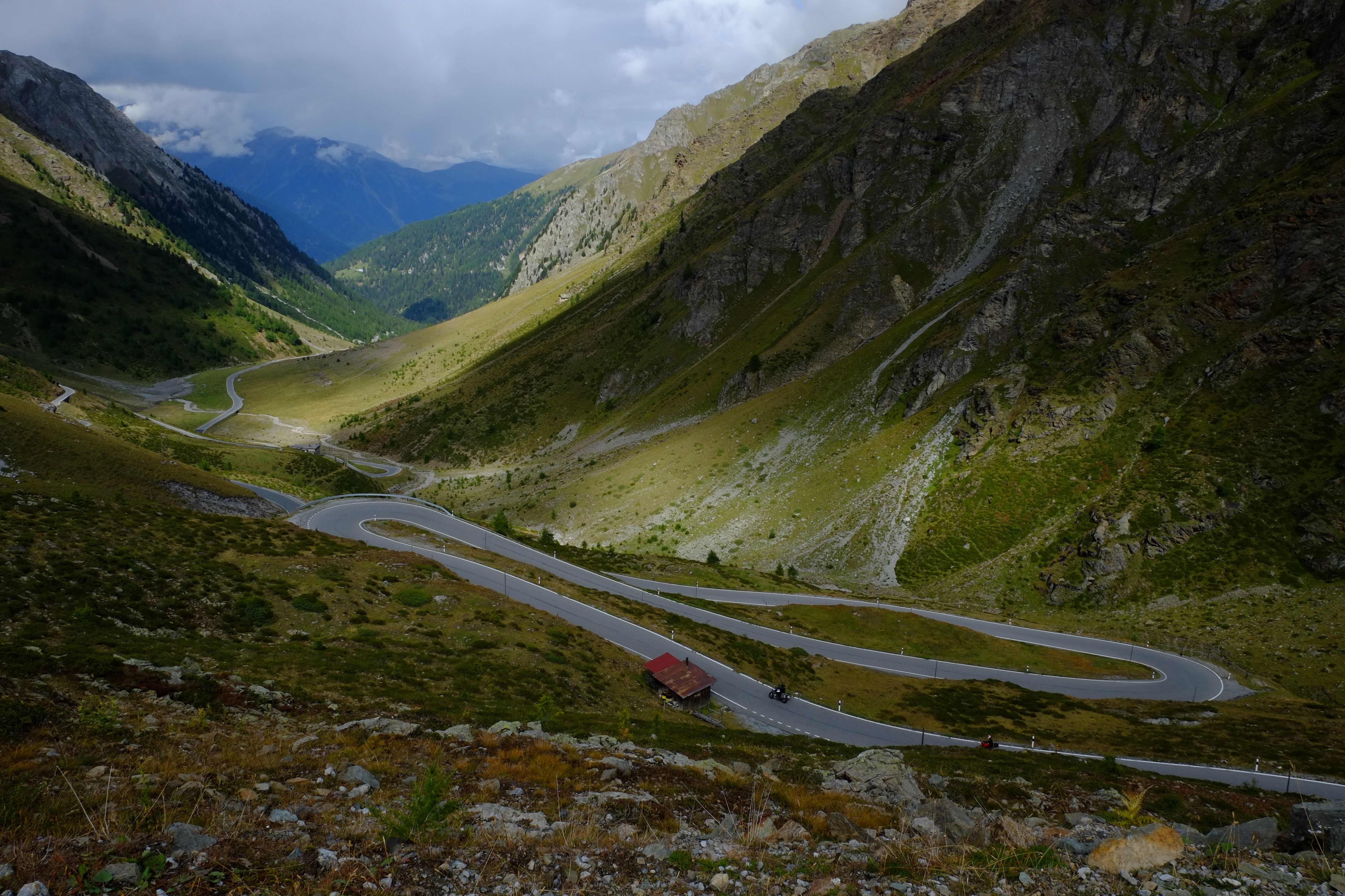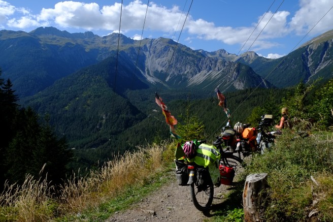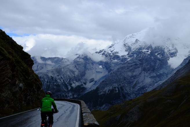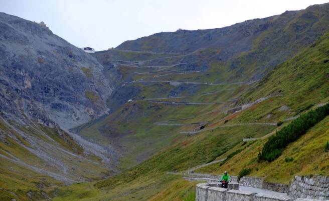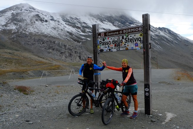 Wir gingen auch mit unseren Rädern auf Tour und erfüllten uns einen weiteren Traum: wir erradelten das Stilfser Joch, das für seine über 40 Kehren und fantastischen Aussichten bekannt ist. Wir starten früh morgens bei strahlendem Sonnenschein. Um zu vermeiden, dieselbe Strecke zweimal zu radeln, entschieden wir uns für die Strecke über die Schweiz, mussten dafür aber erst einen anderen Pass schaffen. Als wir endlich den ersten Pass hinter uns hatten änderte sich das Wetter und Wolken bedeckten den Himmel. Was uns zunächst nichts ausmachte, da der schattige Anstieg etwas einfacher war. Allerdings fing es just an zu schneien, als wir den Gipfel erreicht hatten. Es war saukalt und von schöner Aussicht konnte keine Rede sein. Und so schaufelten wir erst einmal eine riesige Portion Spaghetti Bolognese in uns rein, bevor wir dick eingepackt wieder nach unten rollten. Immer wieder öffnete sich der Himmel und lies ein Paar atemberaubende Blicke ins Tal zu.