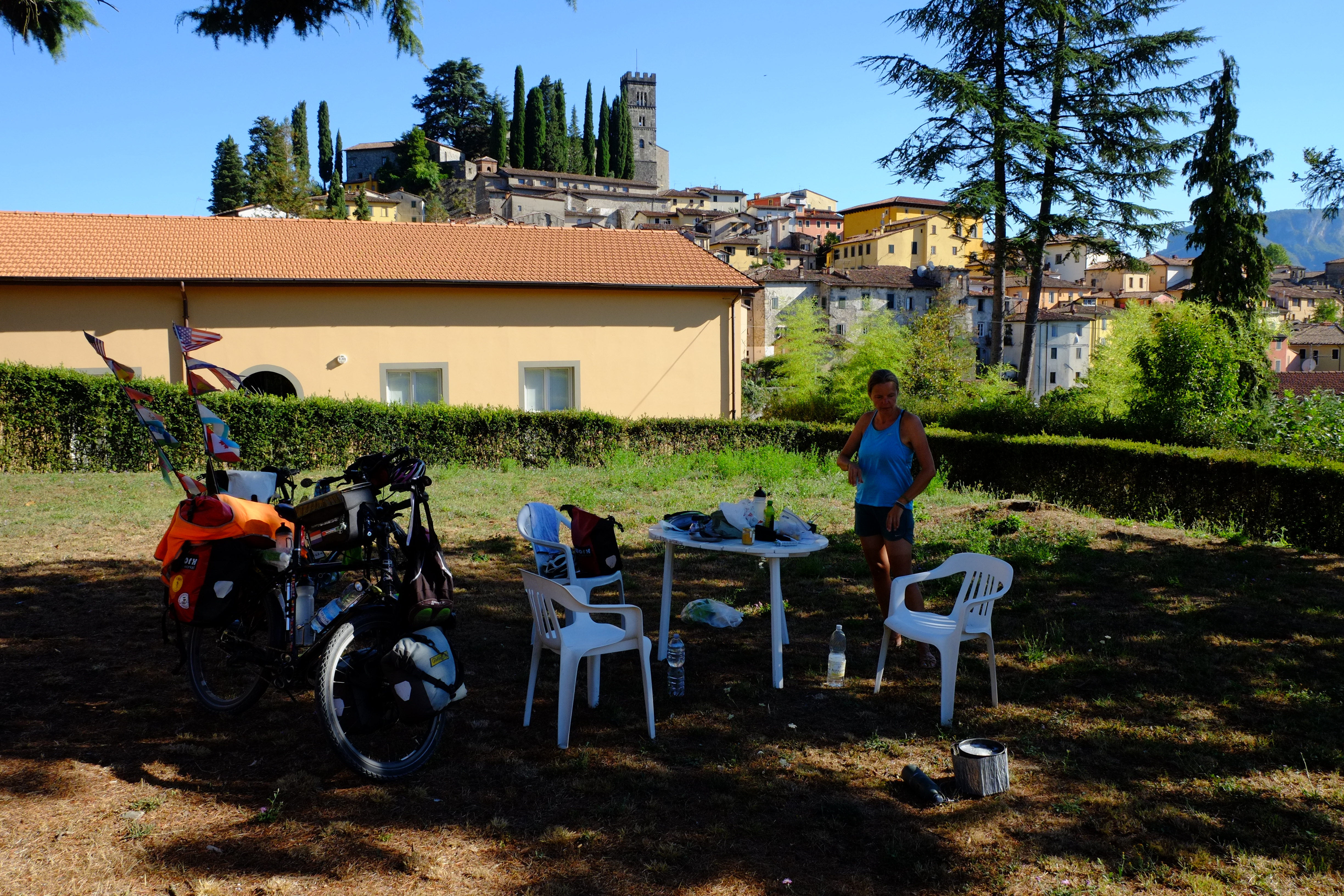 22. Juli – 7. Oktober 2016 – Nach einem albtraumartigen Rückflug nach Europa – einschließlich storniertem Flug und Chaos am Frankfurter Flughafen – kamen wir doch noch mit einer Verspätung von 24 Stunden und ohne Gepäck in Florenz in Italien an. Pläne mussten wieder einmal geändert werden. Anstelle mit den Rädern in die Stadt zu radeln nahmen wir einen Bus, suchten uns ein billiges Hotel und gingen Essen. Wir konnten an der Situation ja sowieso nichts ändern.