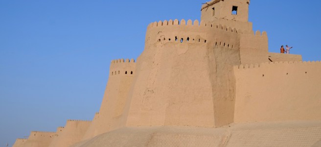 Knowing that it would be unlikely for us to return to Uzbekistan we took a taxi to Khiva, 600km North of Bukhara. The Silk Road town is famous for its slave caravans, barbaric cruelty, terrible desert journeys and steppes infested with wild tribesmen. The town itself is like an open air museum with well preserved minarettes, medressas, mosques and boring museums and feels a bit like stepping into another era, if it wasn’t for the many tourist shops and cafés mainly catering for groups. We met Christian from France again and decided to have dinner together. We had met him first in Samarkand, he has been travelling through Central Asia from France with his 4WD car and was now on his way back home on more or less the same route as we were. Earlier that day we had made a reservation at the best restaurant in town and thought it wouldn’t be a problem to dine with one more person. We could not have been more wrong. It took us 15 minutes to convince the waiter that we would either eat all together or not at all at this place. We were almost about to leave when they finally agreed and angrily put a third chair at our table. After weeks of Laghman (noodle soup), Plov (fried rice) and Manty (dumplings filled with meat) we happily ordered hamburgers. Our mouths were watering by the thought of yummy juicy hamburgers American style. The bigger was our disappointment: two meat patties with some rice and mashed potatoes decorated with a leave of lettuce. We were bemused about our own naivity but enjoyed a nice evening with Christian. To our surpise we got a free dessert from the kitchen – maybe they understood that their earlier reaction wasn’t appropriate.