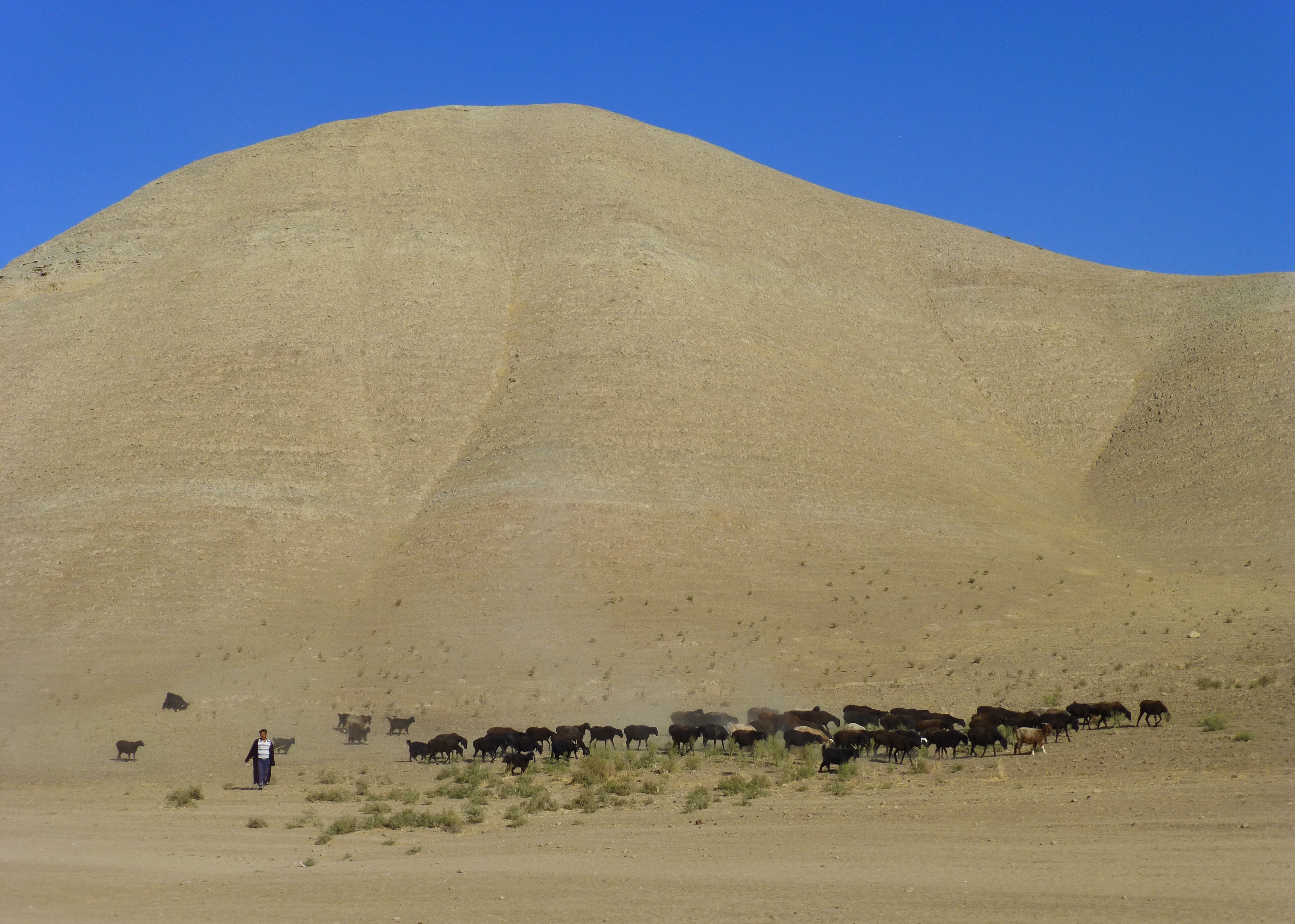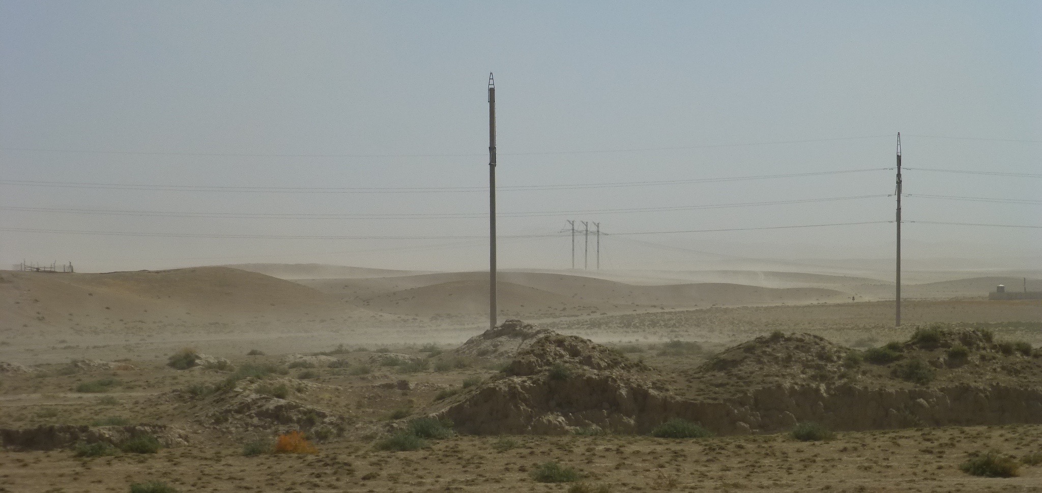 It was once more time to leave the country as our Turkmen transit visas started on 9 October. With only five days to cross the country we wanted to make sure to pass the border as early as possible. We now had two days for the 100 km to get to the border and we only left Bukhara in the early afternoon, cycled until 5pm and pitched our tent in an apple orchard. That night we noticed that our matresses were deflating and by midnight we were both laying on the hard ground. Not a very good prospect as we had to cross the desert in Turkmenistan and would have to camp the coming days with no possibilities to repair the matresses. After a bad-night’s sleep we woke shattered and bad tempered as on top we were facing headwinds. By midday the wind was becoming a sand storm, the air was completely yellow and sandy, our sight very limited and the atmosphere eerie. We struggled to get to the border on time even though we had only a distance of around 60km to cover. But this time our delay turned to our favour as the customs officers wanted to go home and hardly checked our luggage and within 20 minutes we were officially checked out of Uzbekistan.