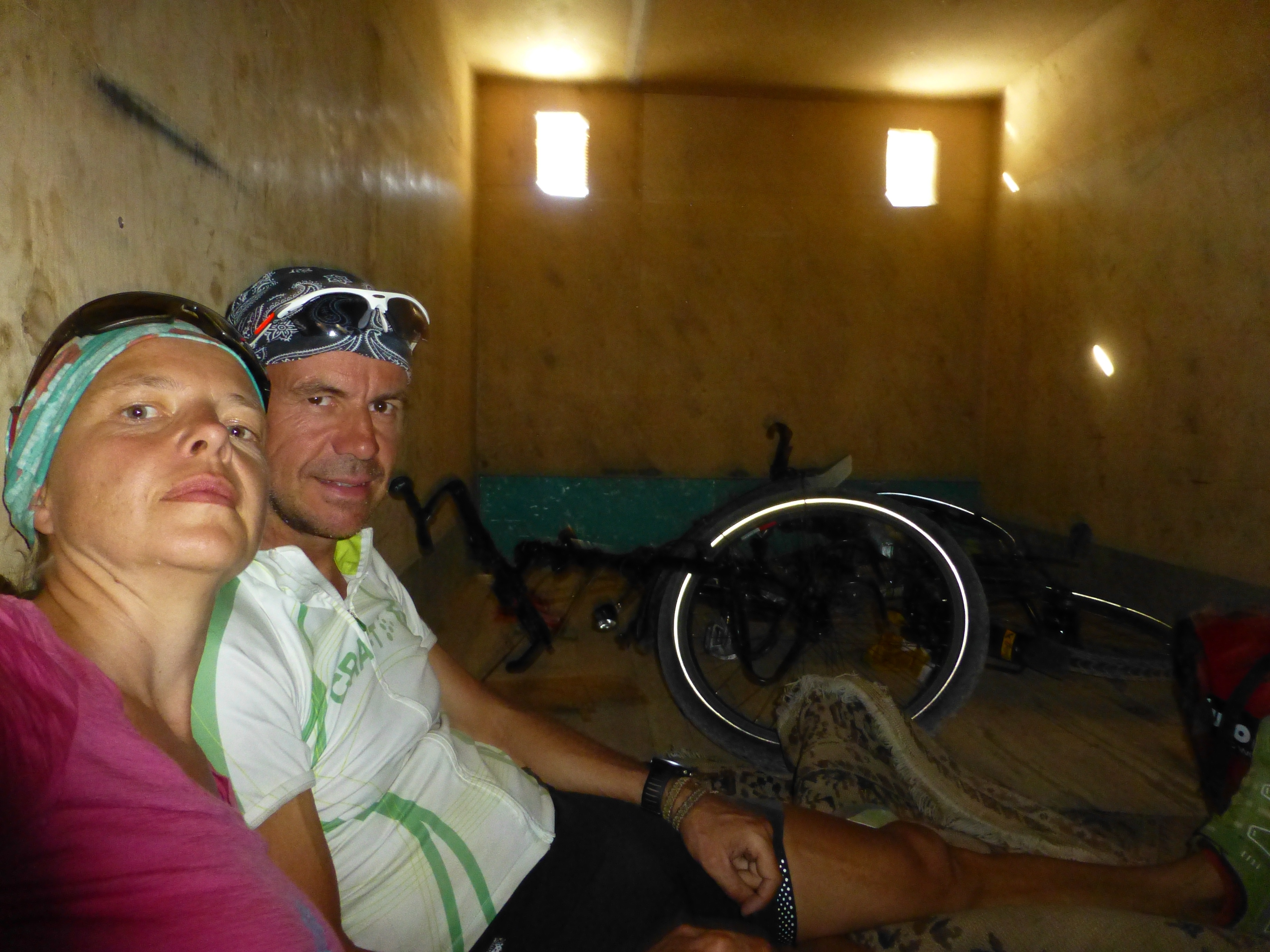 Which turned out to become a challenge. We dismissed the luxury 4-star-hotel on the way because we didn’t want to pay 60$. If we had had the second sight we would have just stayed and made use of a luxury stay. But we continued instead and stopped at a brand-new village to try to find a camp spot. We asked a few people but all refused and sent us away. One woman belonging to the local police asked 50$ to stay at her home but we also dismissed this ‘friendly’ offer and moved on to the next village. A few questions and a few more refusals later, one family finally invited us in. We showed them our instant noodle soup as we didn’t want them to cook for us – this time the place looked rather poor – and for the first time the whole family would join us for dinner. We of course would get our noodle soup but also had to eat their food – cabbage with saussages. All evening neighbours and more family members would pass by to say hello and at around 8pm we could go to sleep. About an hour later there was a knock on the door, our host came in repeating several times: “Palatka, you go, go!” Someone must have told the police about us and our hosts were getting into trouble. We quickly packed up our stuff and cycled in our pyjamas into the dark back to the very busy main highway. There was no way to pitch our palatka (tent) in the fields around us, that we knew from when we arrived here. We though remembered a small platform next to the highway and a house where we now wanted to ask to pitch our tent. As we couldn’t see anything, we cycled slowly on the shoulder against the traffic and reached that place after a few hundred meters that felt like kilometres. Unfortunately we were directly refused and couldn’t convince them to let us pitch the tent anywhere near the house. Instead, they sent us back to the expensive hotel. Grudgingly we moved to the right side of the road and cycled another five kilometres back to the hotel through the eerie darkness to where we’ve been a few hours ago, checked into a very nice, clean and luxury room with a soft bed, white bed sheets, soft pillows, and a perfectly working bathroom with white towels, a real shower, a sink and a Western-style toilet and still went to bed dirty at around 10:30pm. The shower had to wait until the next morning.
